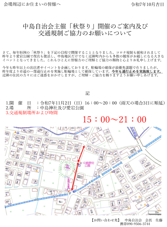 11月2日(日)に開催を予定しております秋祭りにて、多数の方のご来場が予想されるため、下記の通り交通規制を行います。